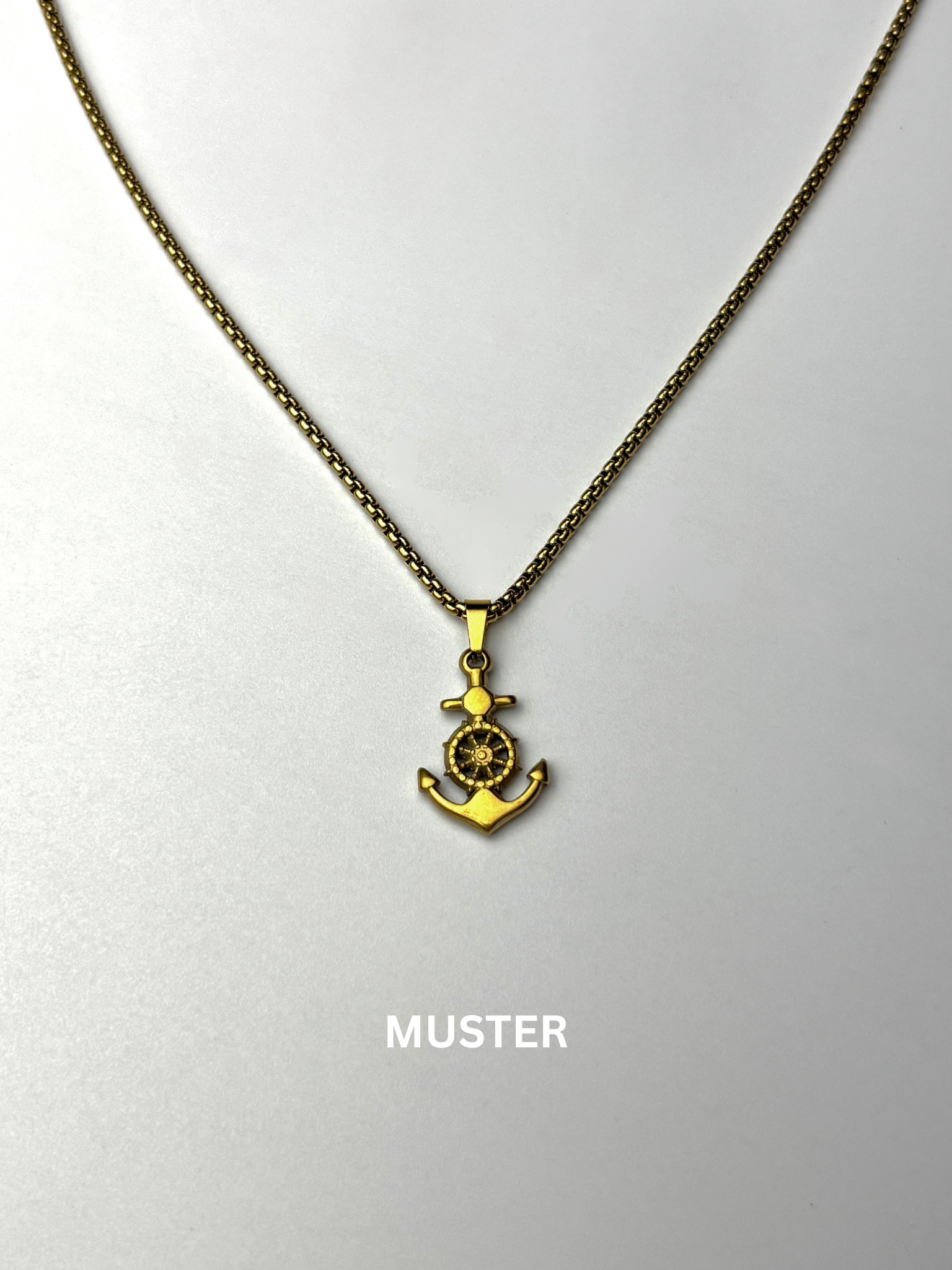 This gold-tone box chain necklace features a precision-crafted, tight-knit chain design paired with a detailed nautical anchor and helm pendant for a sleek, modern finish.